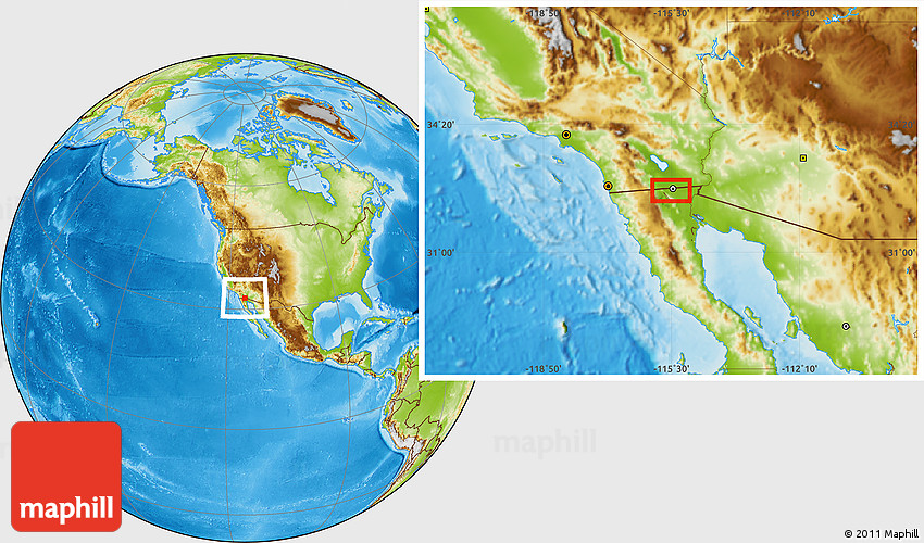 Maphill is a collection of map images. This image combines a physical map with the globe centered on Flor del Desierto. Use the buttons under the image to switch to different map types.