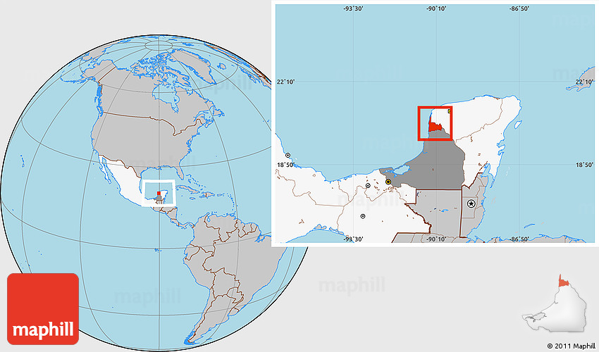 Maphill is a collection of map images. This image combines a gray map with the globe centered on Calkini. Use the buttons under the image to switch to different map types.