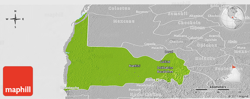 The panoramic physical map represents one of several map types and styles available. Look at Calkini, Campeche, Mexico from different perspectives.