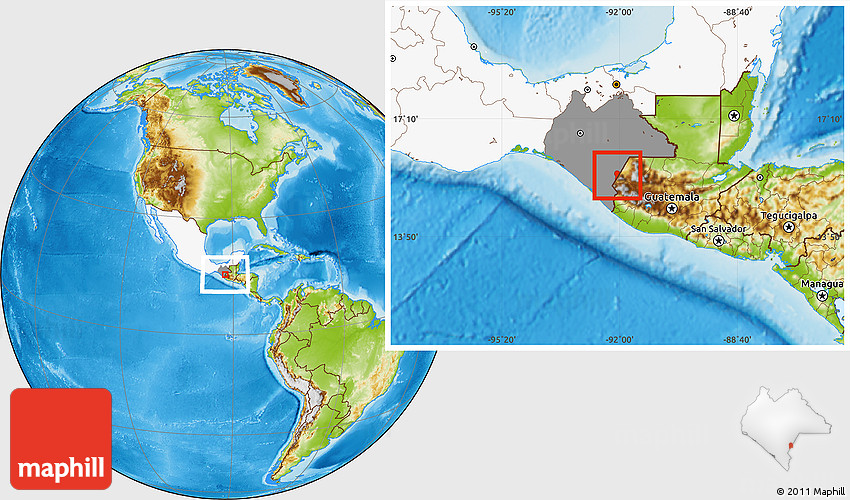 Maphill is a collection of map images. This image combines a physical map with the globe centered on Amatenango de la F.. Use the buttons under the image to switch to different map types.