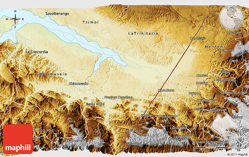 Physical map illustrates the mountains, lowlands, oceans, lakes and rivers and other physical landscape features of Frontera Comalapa. Differences in land elevations relative to the sea level are represented by color.