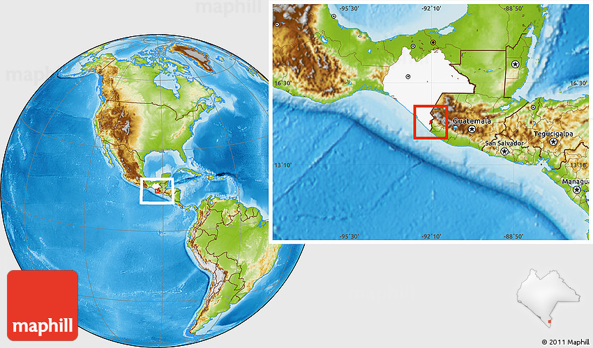 Maphill is a collection of map images. This image combines a physical map with the globe centered on Tuxtla Chico. Use the buttons under the image to switch to different map types.