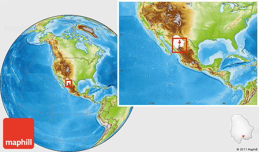 Maphill is a collection of map images. This image combines a physical map with the globe centered on Hidalgo del Parral. Use the buttons under the image to switch to different map types.