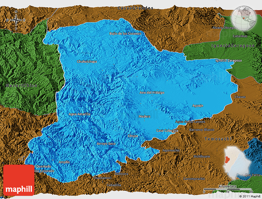 The panoramic political map represents one of several map types and styles available. Look at Madera, Chihuahua, Mexico from different perspectives.