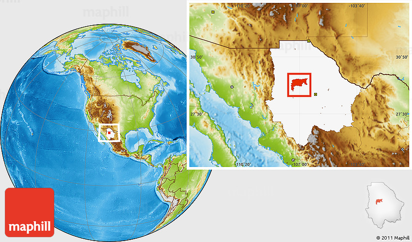 Maphill is a collection of map images. This image combines a physical map with the globe centered on Namiquipa. Use the buttons under the image to switch to different map types.