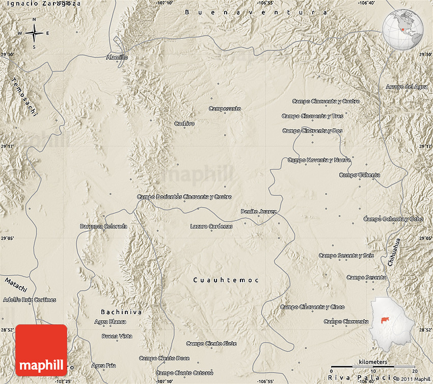 Maphill is a collection of map images. This shaded relief map of Namiquipa is one of them. Click on the Detailed button under the image to switch to a more detailed map.