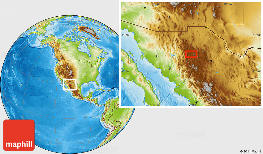 Maphill is a collection of map images. This image combines a physical map with the globe centered on Santa Ana Babícora. Use the buttons under the image to switch to different map types.