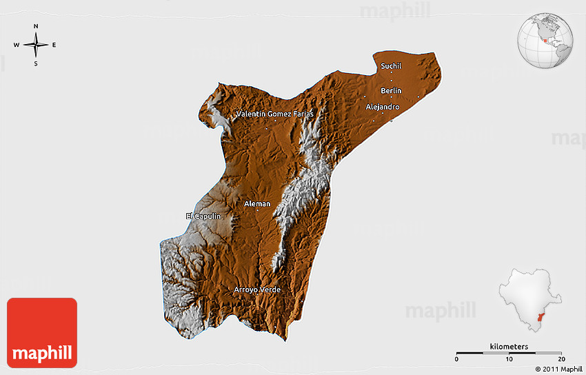 Physical map illustrates the mountains, lowlands, oceans, lakes and rivers and other physical landscape features of Suchil. Differences in land elevations relative to the sea level are represented by color.