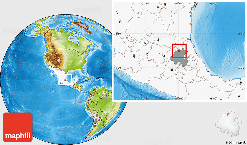 Maphill is a collection of map images. This image combines a physical map with the globe centered on Chapulhuacan. Use the buttons under the image to switch to different map types.