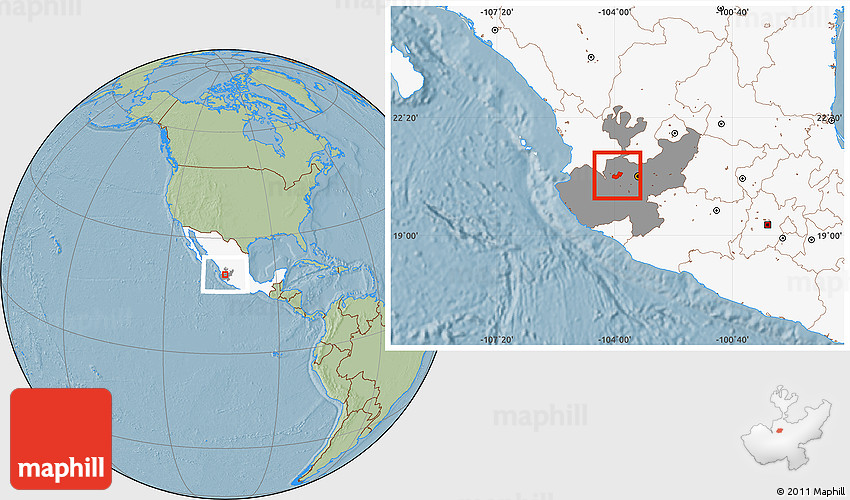 Maphill is a collection of map images. This image combines a savanna style map with the globe centered on Ahualulco de Mercado. Use the buttons under the image to switch to different map types.