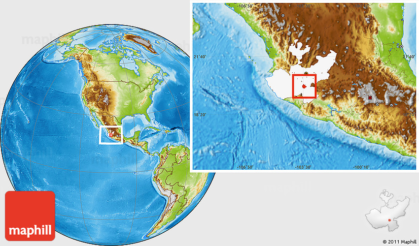 Maphill is a collection of map images. This image combines a physical map with the globe centered on Atoyac. Use the buttons under the image to switch to different map types.