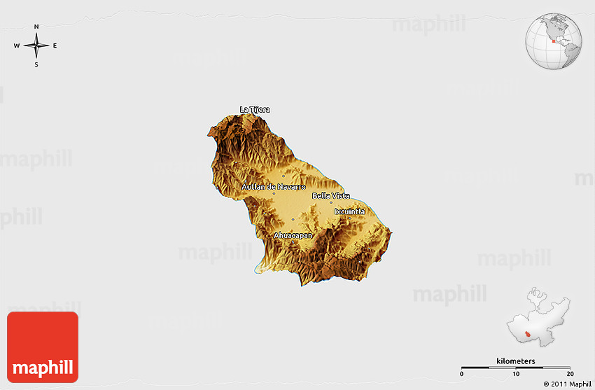 Physical map illustrates the mountains, lowlands, oceans, lakes and rivers and other physical landscape features of Autlan de Navarro. Differences in land elevations relative to the sea level are represented by color.