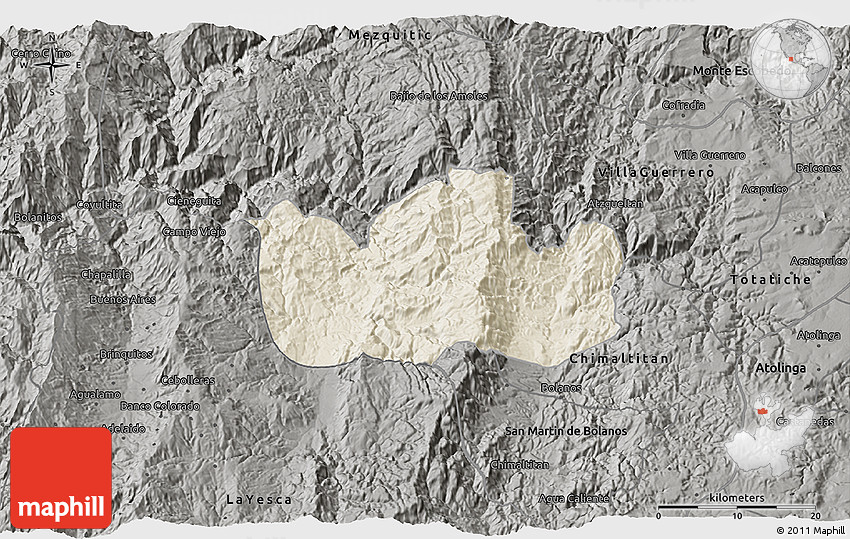 The 3D shaded relief map represents one of several map types and styles available. Look at Bolanos, Jalisco, Mexico from different perspectives.