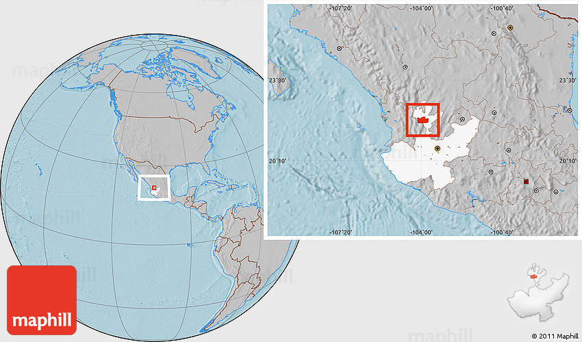 Maphill is a collection of map images. This image combines a gray map with the globe centered on Bolanos. Use the buttons under the image to switch to different map types.