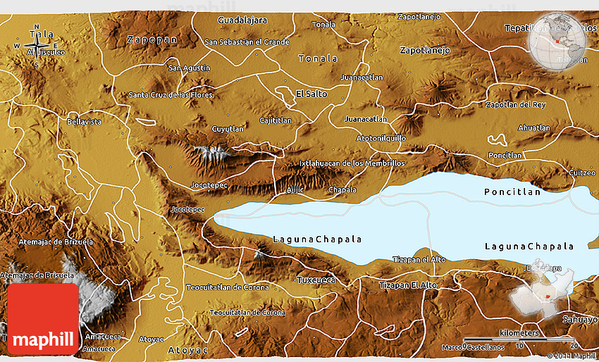 Physical map illustrates the mountains, lowlands, oceans, lakes and rivers and other physical landscape features of Chapala. Differences in land elevations relative to the sea level are represented by color.
