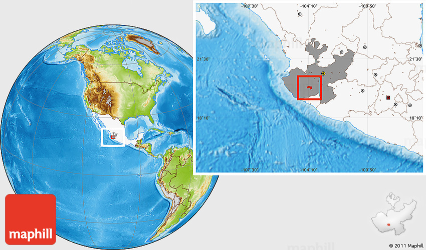 Maphill is a collection of map images. This image combines a physical map with the globe centered on Ejutla. Use the buttons under the image to switch to different map types.