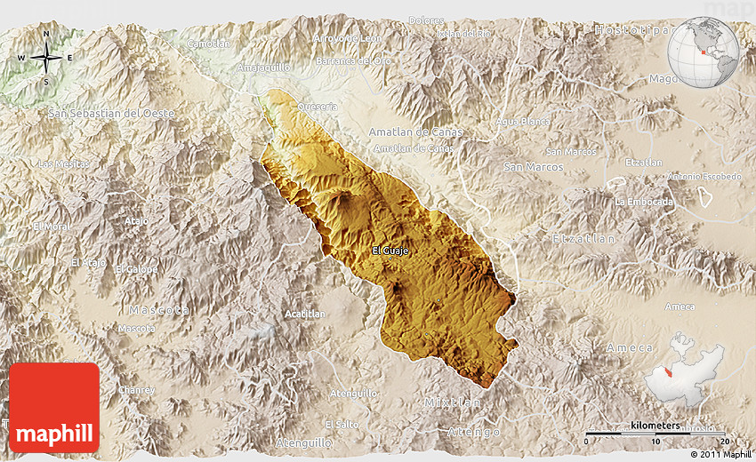 The 3D physical map represents one of several map types and styles available. Look at Guachinango, Jalisco, Mexico from different perspectives.