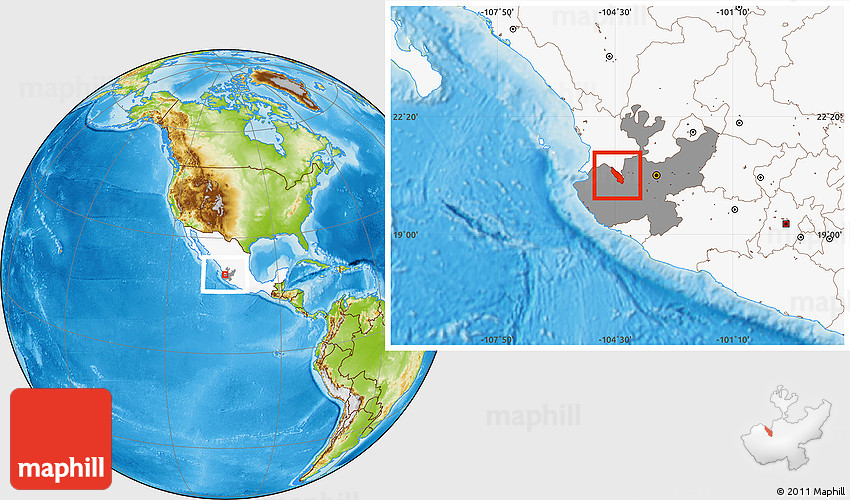 Maphill is a collection of map images. This image combines a physical map with the globe centered on Guachinango. Use the buttons under the image to switch to different map types.