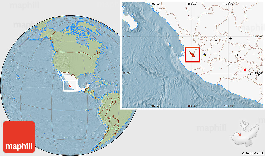 The location map of Guachinango combines two projections: the orthographic azimuthal projection for the globe and the simple geographic projection for the rectangular part of the map. Geographic projection has straight meridians and parallels, each degree of latitude and longitude is the same size over the entire world map.