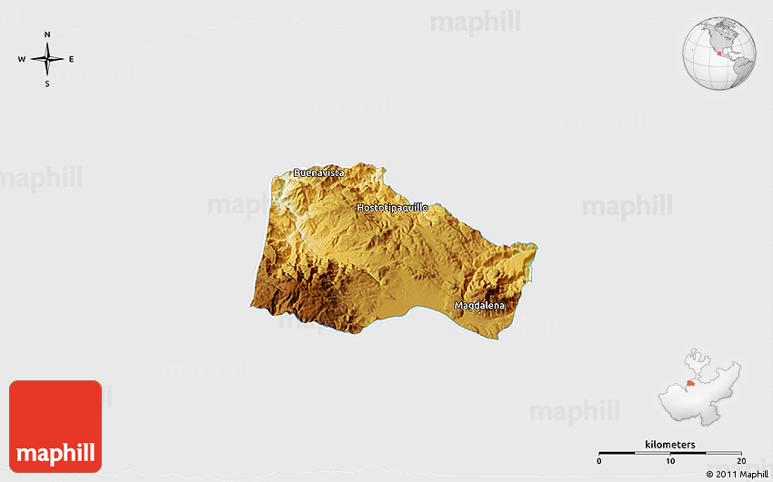 The 3D physical map represents one of several map types and styles available. Look at Hostotipaquillo, Jalisco, Mexico from different perspectives.