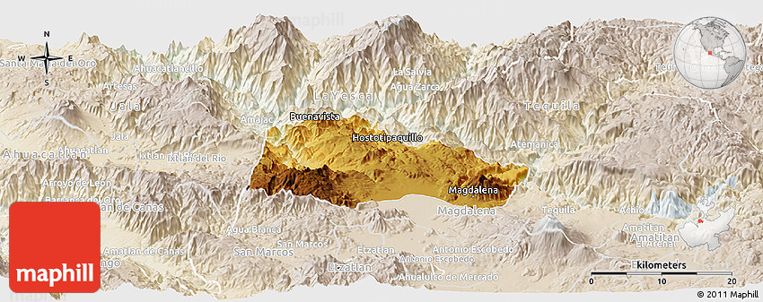 The panoramic physical map represents one of several map types and styles available. Look at Hostotipaquillo, Jalisco, Mexico from different perspectives.