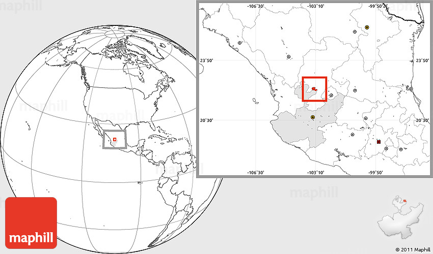Maphill is a collection of map images. This image combines a blank map with the globe centered on Huejucar. Use the buttons under the image to switch to different map types.