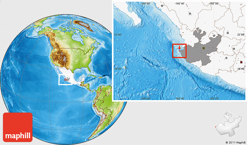 Maphill is a collection of map images. This image combines a physical map with the globe centered on Isla. Use the buttons under the image to switch to different map types.