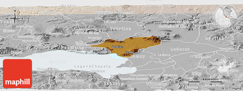 The panoramic physical map represents one of several map types and styles available. Look at Ocotlan, Jalisco, Mexico from different perspectives.