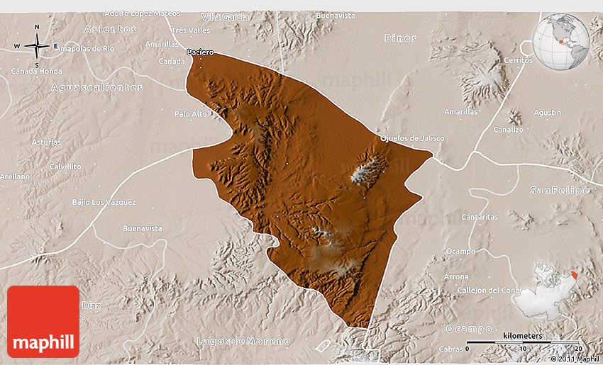 Physical map illustrates the mountains, lowlands, oceans, lakes and rivers and other physical landscape features of Ojuelos de Jalisco. Differences in land elevations relative to the sea level are represented by color.