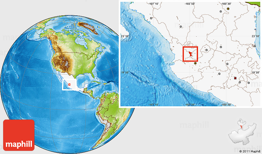 Maphill is a collection of map images. This image combines a physical map with the globe centered on San Martin de Bolanos. Use the buttons under the image to switch to different map types.