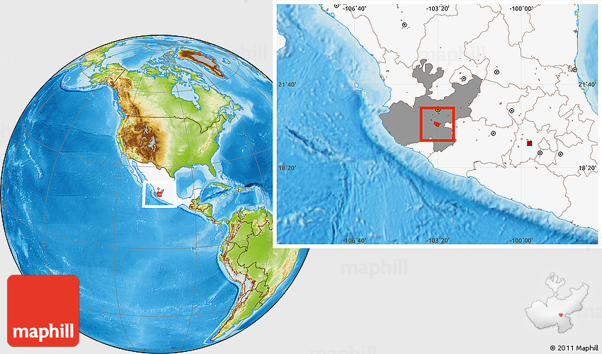 Maphill is a collection of map images. This image combines a physical map with the globe centered on Teocuitatlan de Corona. Use the buttons under the image to switch to different map types.