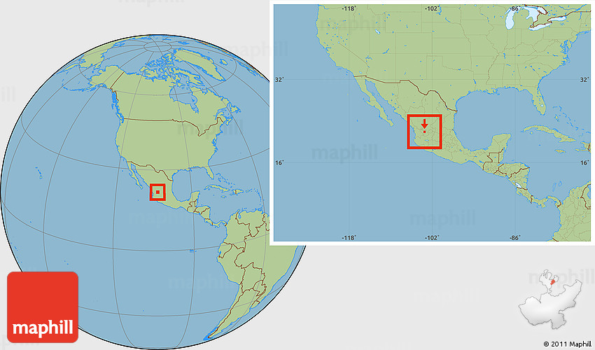 The location map of Totatiche combines two projections: the orthographic azimuthal projection for the globe and the simple geographic projection for the rectangular part of the map. Geographic projection has straight meridians and parallels, each degree of latitude and longitude is the same size over the entire world map.