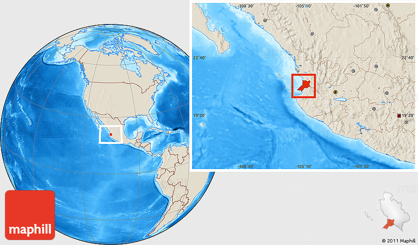 Maphill is a collection of map images. This image combines a shaded relief map with the globe centered on Compostela. Use the buttons under the image to switch to different map types.