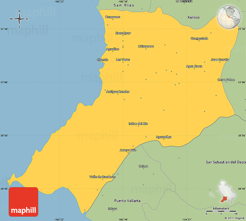The simple savanna style outline map represents one of several map types and styles available. Look at Compostela, Nayarit, Mexico from different perspectives.