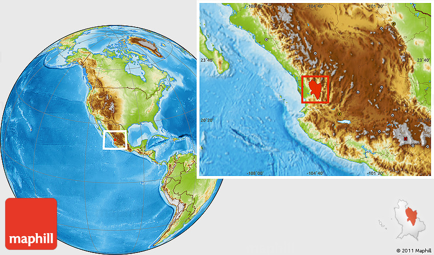 Maphill is a collection of map images. This image combines a physical map with the globe centered on El Nayar. Use the buttons under the image to switch to different map types.