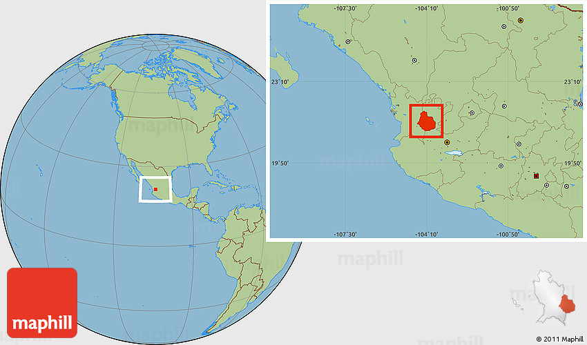 Maphill is a collection of map images. This image combines a savanna style map with the globe centered on La Yesca. Use the buttons under the image to switch to different map types.