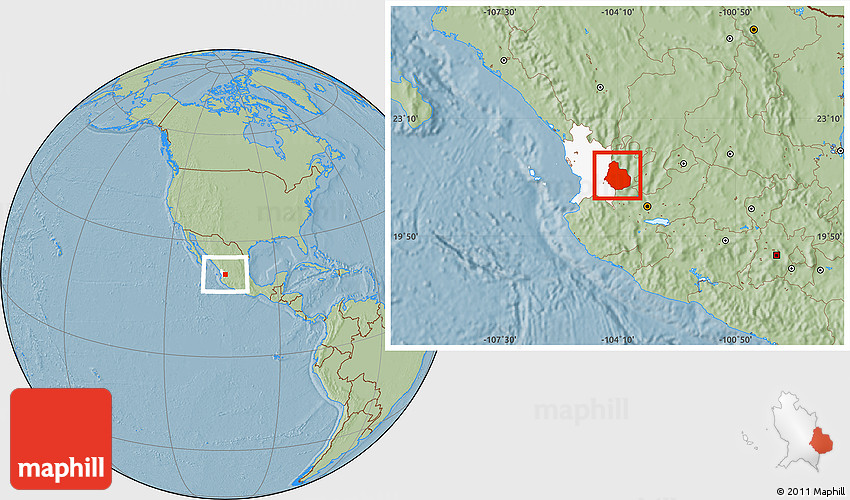 Maphill is a collection of map images. This image combines a savanna style map with the globe centered on La Yesca. Use the buttons under the image to switch to different map types.