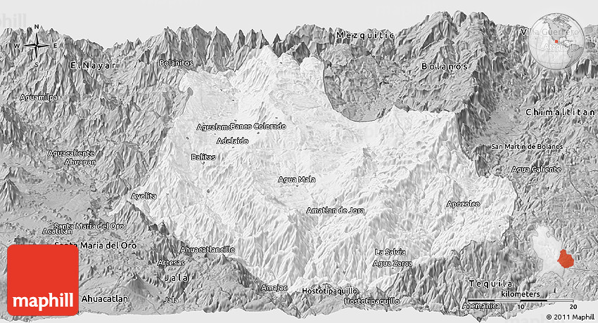 The panoramic gray map represents one of several map types and styles available. Look at La Yesca, Nayarit, Mexico from different perspectives.