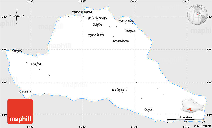 The simple silver style outline map represents one of several map types and styles available. Look at Dist. Miahuatlan, Oaxaca, Mexico from different perspectives.
