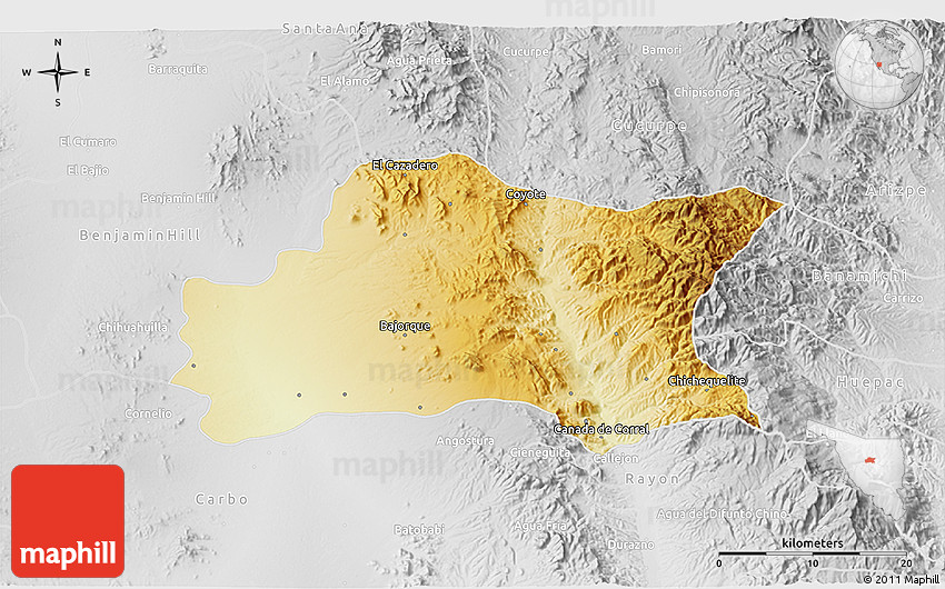 The 3D physical map represents one of several map types and styles available. Look at Opodepe, Sonora, Mexico from different perspectives.