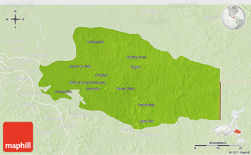 Physical map illustrates the mountains, lowlands, oceans, lakes and rivers and other physical landscape features of Balancan. Differences in land elevations relative to the sea level are represented by color.