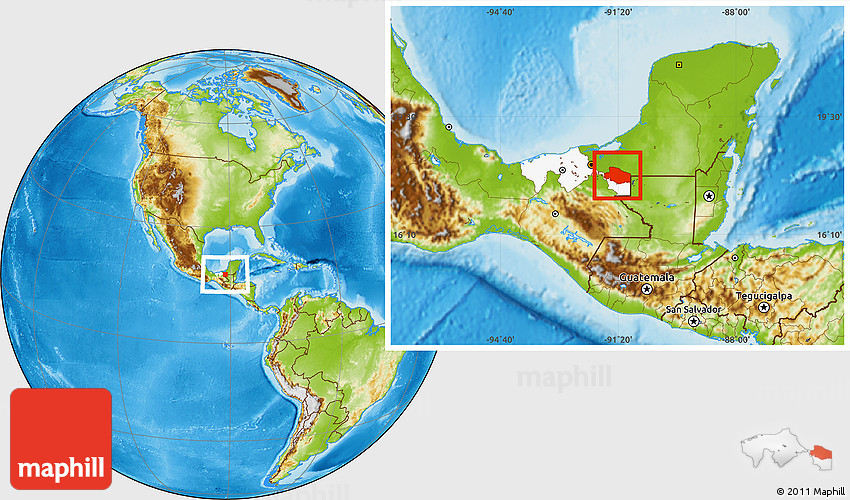 Maphill is a collection of map images. This image combines a physical map with the globe centered on Balancan. Use the buttons under the image to switch to different map types.