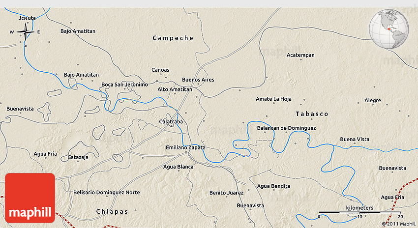 The 3D shaded relief map represents one of many map types and styles available. Look at Santa Rosa, Emiliano Zapata, Tabasco, Mexico from different perspectives.