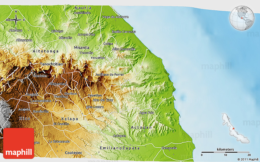 The 3D physical map represents one of several map types and styles available. Look at Alto Lucero, Veracruz, Mexico from different perspectives.