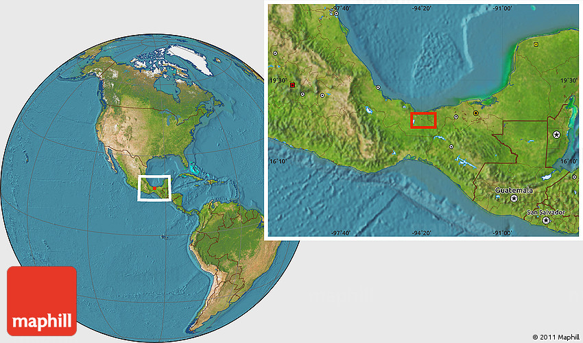 Maphill is a collection of map images. This image combines a satellite map with the globe centered on Nuevo Mundo. Use the buttons under the image to switch to different map types.