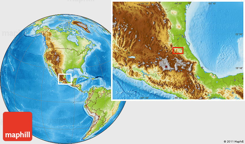 Maphill is a collection of map images. This image combines a physical map with the globe centered on Tecomajapa. Use the buttons under the image to switch to different map types.