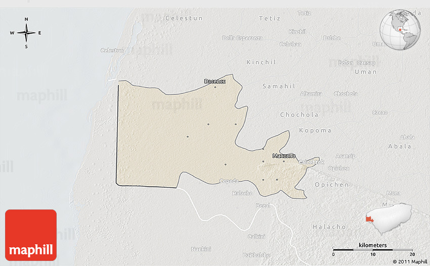The 3D shaded relief map represents one of several map types and styles available. Look at Maxcanu, Yucatan, Mexico from different perspectives.