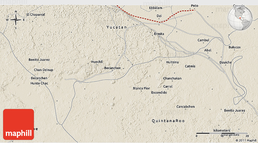 The 3D shaded relief map represents one of many map types and styles available. Look at Yaxhachén, Tekax, Yucatan, Mexico from different perspectives.
