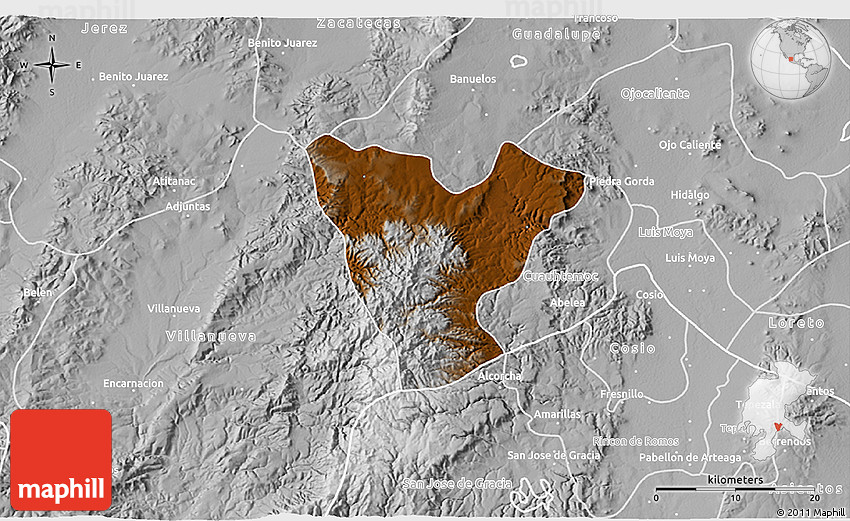 The 3D physical map represents one of several map types and styles available. Look at Genaro Codina, Zacatecas, Mexico from different perspectives.