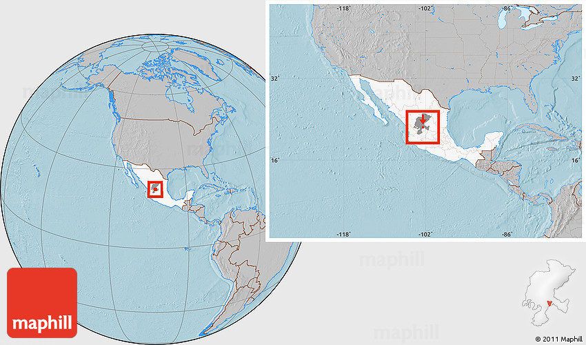 Maphill is a collection of map images. This image combines a gray map with the globe centered on Genaro Codina. Use the buttons under the image to switch to different map types.